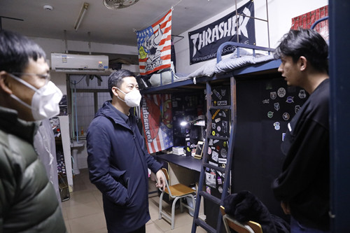 本网讯 12月6日晚,我校校长向罗生带队深入学生宿舍走访慰问学生,了解学生离校返乡、线上网课学习情况,并就相关工作提出指导意见。学校副校长成涛、副校长侯新华,党政办、学生工作部、保卫部、后勤处等相关部门负责人,相关二级学院党总支书记、辅导员、班主任等共同参加了巡查走访。
