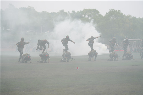 紧接着,特色方阵相继亮相,引发全场掌声雷动。军体拳方阵率先入场,他们动作整齐划一、刚劲有力,一招一式展现展现男儿气概;匕首操方阵成员头系红绳,手执“匕首”出场,她们身手敏捷,挑、踢、刺,动作一致,气势如虹;刺杀操方阵高声呐喊“杀、杀、杀”入场,他们眼神锐利,气势磅礴,每一次出枪都做到稳、准、狠;“硝烟”四起,战术方阵小心匍匐,翻滚、爬行再卧倒就位,模拟表演了解救被困“人质”的过程。