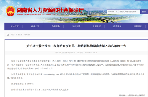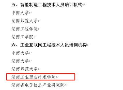 本网讯 近日,从湖南省人社厅获悉,人社部遴选确认了数字技术工程师培育项目第二批培训机构拟入选名单,我校成功入选工业互联网工程技术人员培训机构。据了解,湖南省工业互联网工程技术人员培训机构共有4家院校和1家研究机构入选,分别为中南大学、湖南大学、湖南师范大学、yabocom(中国)官方网站、湖南省电子信息产业研究院,我校是入选该职业培训机构中唯一一所高职院校,将为湖南省培养更多高素质工业互联网工程技术人员。