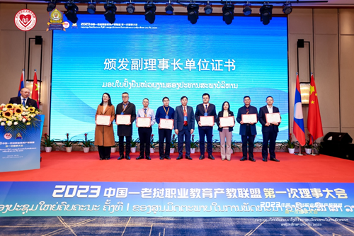 本网讯 近日,中国-老挝职业教育产教联盟第一次理事大会在长沙举行,会议公布了联盟成员单位名单,审议通过了《中国-老挝职业教育产教联盟章程》,我校副校长谢希钢出席了会议并代表学校获颁联盟副理事长单位证书。