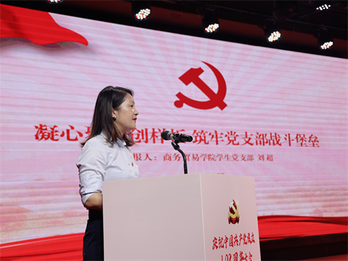 全国样板党支部、商务贸易学院学生党支部书记刘超同志做经验分享。她介绍道,党支部通过构建“一体两翼三驱动”党建工作模式,打造“楚怡先锋”党建品牌等做法,搭建了“党建+产业帮扶”“党建+就业帮扶”“党建+育人平台”三大特色工作体系及志愿活动、社会实践、创新创业、技能竞赛四大平台,持续提升支部党建工作质量,充分发挥示范引领和辐射带动作用,助力商科工匠成长成才。