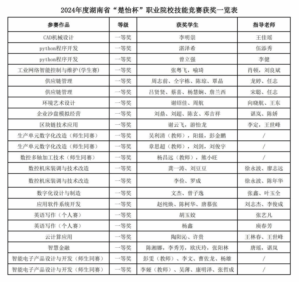 本网讯 近日,2024年度“楚怡杯”湖南省职业院校技能竞赛圆满落幕。本次大赛共吸引全省95所高职学校(含技工院校)11283名(含教师477人)选手参加了21个专业大类102个学生技能竞赛赛项、10个师生同赛和12个教师技能竞赛赛项的比赛,参赛总人数14768人。