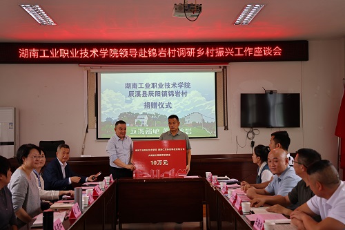 锦岩村党总支书记姚茂爱、学校驻村工作队队员、爱心企业等参加乡村振兴工作座谈会。会上,学校协同爱心企业湖南仁丰环保科技有限公司为锦岩村捐赠十万元。