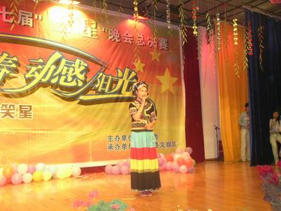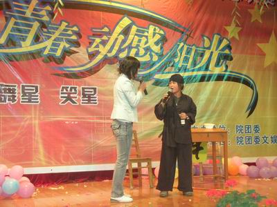 “歌星”得主李康乐平同学也是出口不凡,一首《幸福山歌》,如行云流水,征服了在场所有评委和广众。而王艳丽等同学表演的小品——《都是超女惹的祸》,更是独出心裁,幽默诙谐,令台下掌声、尖叫声此起彼伏,热烈的气氛感染了在场的所有人。因而被评为了本届“三星”晚会的“笑星”。