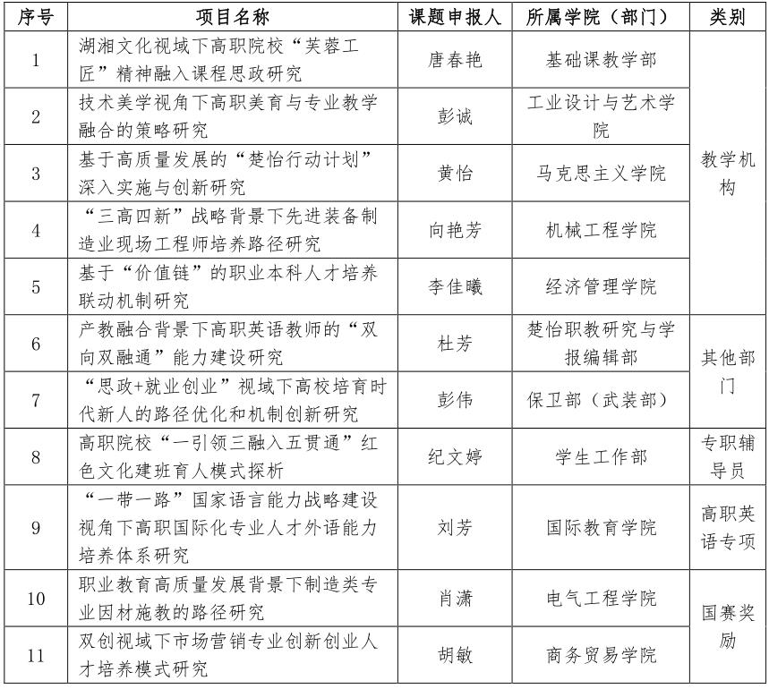 根据省教育厅《关于做好2022年湖南省职业院校教育教学改革研究项目申报工作的通知》和我校《关于申报2022年湖南省职业院校教育教学改革研究项目的通知》的通知要求,抽取校外专家对申报的44项项目进行评审,评审结果经学校审核批准,现将拟推荐项目公示如下: