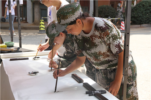 楚艺书法协会协会成员一同用毛笔书写“欢迎小萌新”“军训加油”等祝福语。现场摆放着宣纸以供新生们书写留言、表达军训想法、憧憬大学生活。活动中,新生们纷纷上前用毛笔签名与留言。楚艺书法协会的学长学姐们耐心地给新生们纠正握笔姿势,讲解书法的发展历史。楚艺书法协会还准备了相关书法与国画作品进行摆台展示,以供师生观赏。
