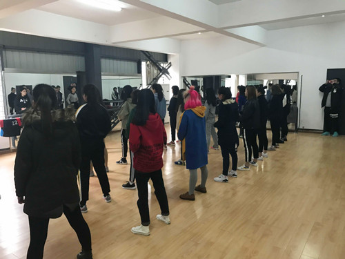 3月14日,啦啦队第一堂课在学院训练馆形体房正式开课了,在带训老师的指点下学员们尽力练好每个动作。