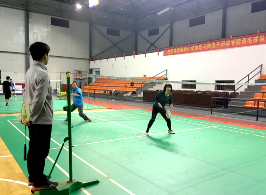 本网讯 3月30日晚7点,学院训练馆灯火通明,热闹非凡。受学院工会委托,我院教职工羽毛球协会与湖南大学物理与微电子科学学院段高辉教授等一行八人进行了一场羽毛球友谊赛。学院调研员刘琼教授参加了此次比赛。院大学生羽毛球协会5名同学担任本次比赛的裁判工作。
