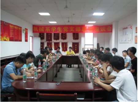 本网讯 6月10日下午,机械工程系学生党支部在图书馆八楼机械工程系党员活动室召开了学生党员联谊座谈会。毕业班学生党员、学生党小组组长、入党积极分子代表等参加了交流座谈,座谈会由学生支部负责人曹旺主持。