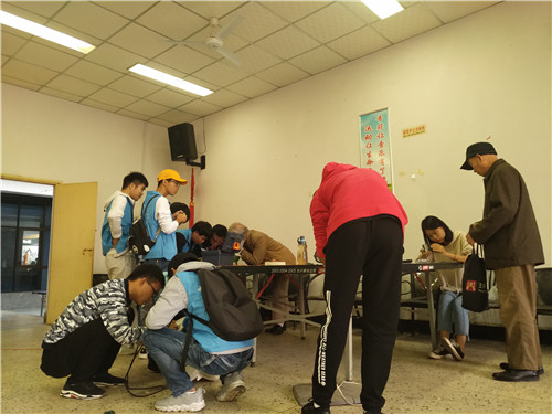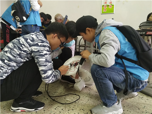 “对于前来维修的居民,先登记问题记录本,然后到技术维修处维修,最后送到安全检测处进行检测。”电子协会会长刘勇规定了活动的流程,志愿者们分工明确,相互配合。志愿者们运用自己的专业知识查线路、找元件、换零件等,探讨分析问题所在,拆卸、检测、维修、安装,将居民送来的电器一一修好,很多居民在取走修好的电器时,纷纷握手对志愿者表示感谢。