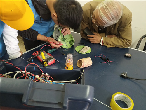 退休教职工吴朴文拿来了自己的台灯进行维修,他亲切地说道:“这些孩子技术真的很棒,我的台灯很快就修好了。他们修了这么久,水都还没喝一口,是一群很负责任的小伙子。”