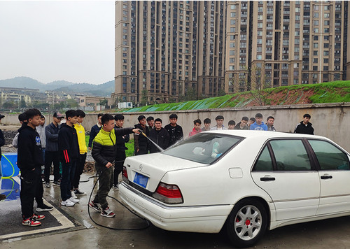 本次活动在汽车工程楼和学生公寓门口进行摆台,车主需先在摆台处领取洗车卡并填好洗车单,随后前往汽车工程大楼前坪参与活动,学生将在专业人员的带领下检测车辆,检测后移至洗车区,进行清洗。