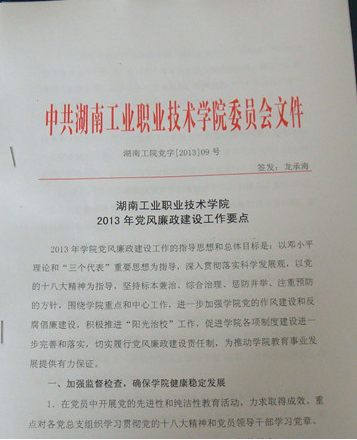 9.进一步完善廉政风险防控体系建设。制定学院《惩治和预防腐败体系2013-2017年工作规划》。今年将会同教务处、后勤处、学生处、招就办、科技处、财务处对招生录取、基建、维修项目、招投标、财务管理、科研经费、学生奖助学金发放情况进行检查,完善有关规章制度。重点对汽车楼、机械楼建设、教学成本分摊管理办法实施和实习工厂财务管理进行监督检查。