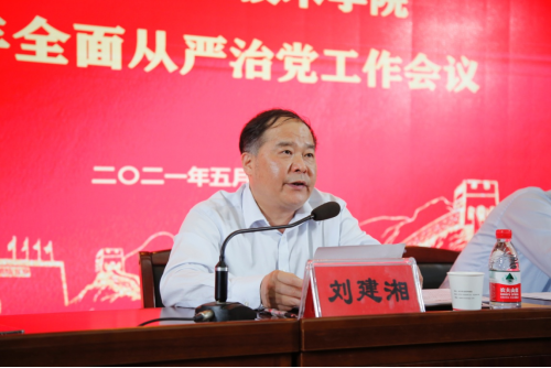 刘建湘指出此次会议主要任务是:深入学习贯彻十九届中央纪委五次全会精神、湖南省纪委十一届六次全会精神以及全国、全省教育系统全面从严治党工作会议工作部署,总结2020年学校全面从严治党工作,分析形势,部署今年的重点工作任务。他对2020年学校全面从严治党工作所取得的成效给予了充分肯定。他指出,要深刻领会全面从严治党的新要求、要分析研判全省教育系统全面从严治党新形势、要清醒认识高校党风廉政建设和反腐败斗争的新问题。他强调,各级党组织和党员干部要切实贯彻落实好党中央、省委的精神,充分发挥全面从严治党的引领保障作用,确保学校中心工作落到实处,抓出成效。他表示,要扎实推动“两个维护”具体化走深走实、扎实推动正风肃纪长效化长管长严、扎实推动基层组织标准化从严从实、扎实推动安全稳定常态化抓常抓长。他指出,全校党员干部要更加紧密地团结在以习近平同志为核心的党中央周围,坚守初心使命,坚定不移推动全面从严治党向纵深发展,为推进学校事业跨越发展保驾护航,为“三高四新”战略实施增值赋能,以优异成绩向建党100周年献礼。