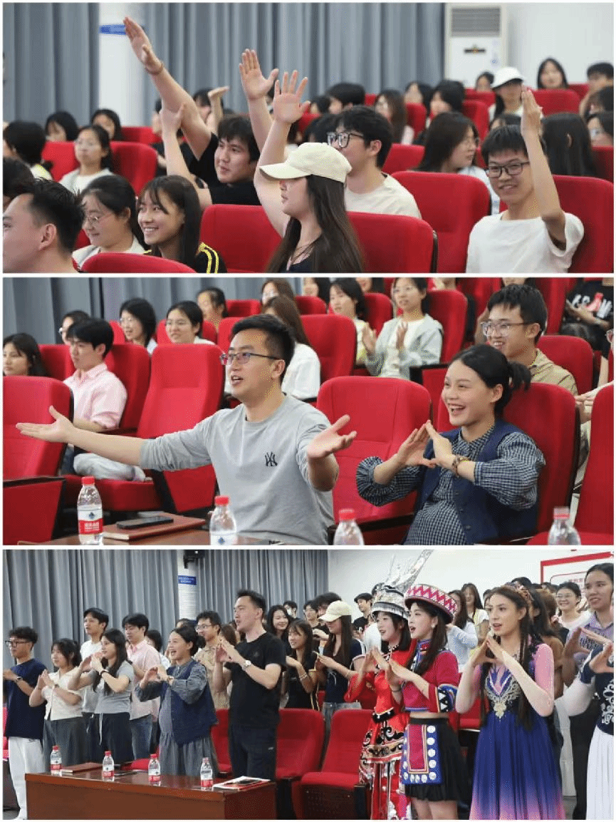 趣味互动环节“民族歌曲猜猜猜”中,师生们通过汉语、苗语、哈萨克语的多语种切换,深切感受中华语言的丰富多彩。随后《爱我中华》集体展演环节,百余名师生用整齐划一的手势舞配合激情澎湃的合唱,以“56个星座56枝花”的经典歌词,抒发了对伟大祖国的热爱和对中华民族大家庭的深情礼赞。