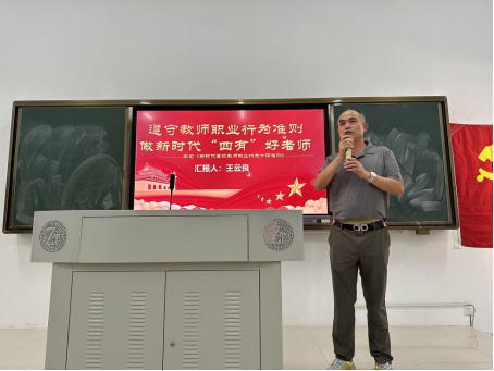 王云良以《遵守教师职业行为准则,做新时代“四好”好老师》为题展开宣讲,他说教师是人类灵魂的工程师,是人类文明的传承者,廉洁是教师立教之本,教师要廉洁从教,坚持廉洁自律,保持教育公正;要用广博的学识,授业解惑,更要用高尚的人格魅力立身传道,成为学生求智、做人的楷模。