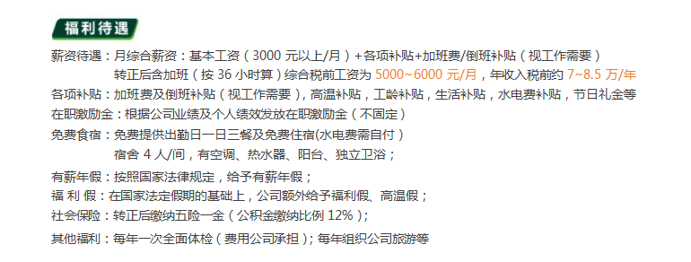 世界500强日产集团 加特可(苏州)自动变速箱有限公司 (日产集团株式会社) 招聘要求: 年龄:18周岁以上; 2、学历:全日制大专学历 专业:数控、机电、机械、模具、汽车制造、汽车检测与维修、物流、钳工、叉车、统计、计算机等专业 新入职员工工资待遇: 1.五险一金(入职即买/年满18周岁):工伤、失业、生育、医疗、养老、公积金 2.报销高铁二等座票、乘飞机报销上限500元。 3.入职企业报销体检费。(实习生经录用后体检没有通过的,体检费同样报销) 基本工资: 基本工资3000+生活补贴+水电费补贴+全勤补贴+通讯补贴+倒班补贴+中夜班补贴=税前工资总额75000-85000元,年终奖4-7个月。