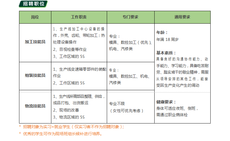 招聘专业:机械制造与自动化,机械装备制造技术,新能源汽车技术,模具设计与制造,汽车制造与装配技术,汽车运用与维修技术