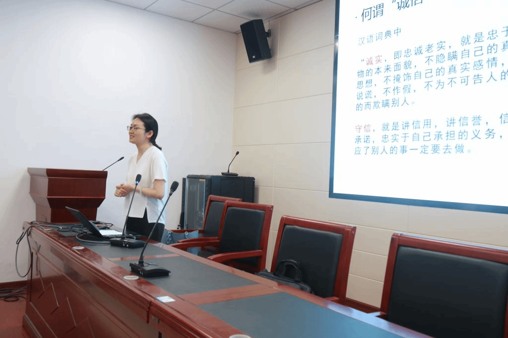 讲座现场,张铃娣围绕“什么是诚信”“在学习中讲诚信”“就业诚信”三个方面展开,对于诚信的定义张铃娣提出,“诚”是忠诚老实, “信”是讲信誉、讲信用,诚信是中华民族延绵千年的传统美德,是当代社会主义核心价值观的重要组成部分,诚信也是个人的立身之本。作为肩负民族复兴重任的新时代青年,应当在学习中讲诚信、在生活中讲诚信、在就业中讲诚信,从自己做起,从小事做起,让诚实守信在校园蔚然成风