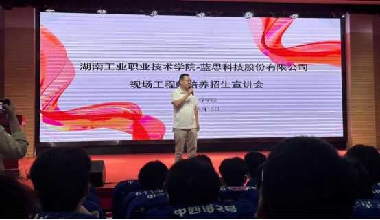 蓝思科技人力总监隋明介绍了公司发展历程、企业文化、校企合作人才培养模式等,表示企业将从场地、师资、资金、设备、就业服务等方面大力支持现场工程师培养,并提供了现场工程师班的报名方式,明确了选拔具体形式和流程,鼓励同学们积极报名。