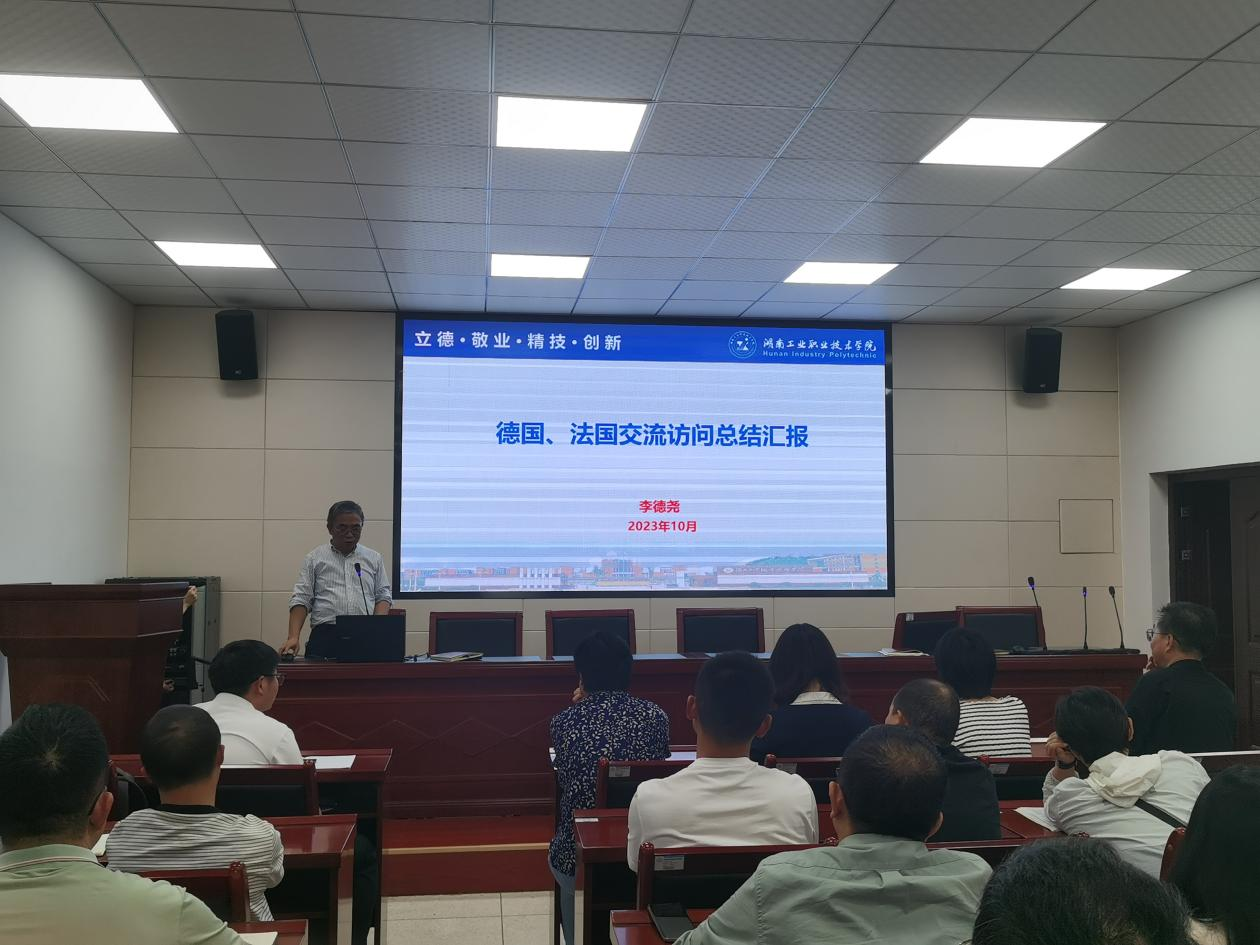 机械工程学院院长李德尧在会上进行分享,首先向全体教职员工分享本次校际交流访问的行程,行程有与我校合作十余年的博世集团(BOSCH)、有着250多年历史的德国手工业行会(HWK)以及埃森经济管理应用技术大学(FOM)等相关的德法大学,然后对行程中的各个单位进行了详细介绍,并介绍了在人才培养、职业资格认证、合作办学、师生互换等方面交流;最后分享了本次校际交流访问的学习体会、后续工作启示与设想,通过思考德法两国与中国在职业教育办学理念、办学方式中的区别,从中构思后续学院在课程建设、教材建设、结构化课程教学团组建、校企合作等方面的工作设想,不断探索探索技能型人才培养的“立交桥”。