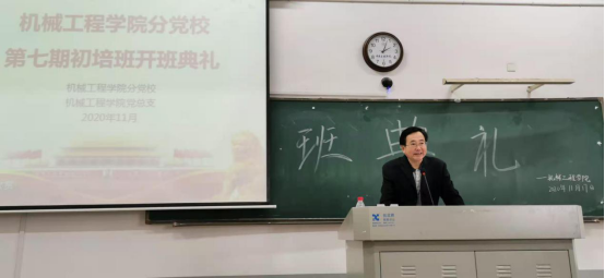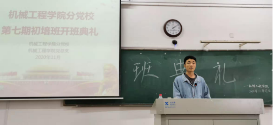 2020年11月17日,机械工程学院分党校在2103阶梯教室举办第七期党史党建初培班开班典礼暨第一堂党课。学院党总支书记马跃龙、机制与检测学生党支部书记李雪艳、团学指导老师杨晶及各辅导员出席开班典礼。本次典礼由机械工程学院组织员邓松林主持。学院全体入党积极分子、学生党员、发展对象共计300余人参加了本次会议。