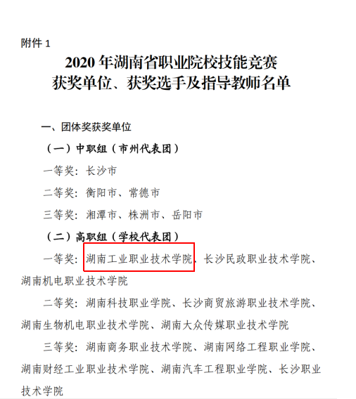 在学校领导高度重视、老师悉心组织培训、学生辛苦准备训练下,我校荣获2020年湖南省职业院校技能竞赛团体奖一等奖第一名的优异成绩。