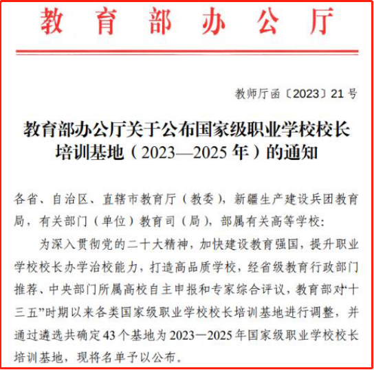 本网讯 近日,教育部办公厅公布了国家级职业学校校长培训基地(2023-2025年)的通知(教师厅函[2023]21号),我校顺利通过遴选,成功获批为2023-2025年国家级职业学校校长培训基地。