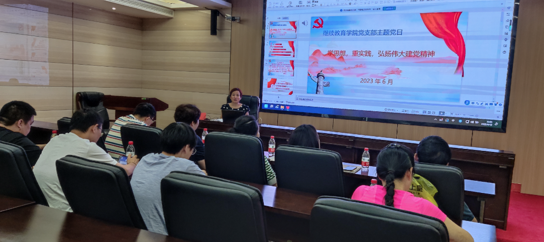 6月12日上午继续教育学院党支部在行政楼第二会议室开展了“学思想,重实践,弘扬伟大建党精神”的主题党日活动。活动由党支部书记龙华主持,全体党员、入党积极分子和群众代表参加。