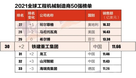 4月28日,2021年全球工程机械制造商50强榜单在北京发布,11家中国企业上榜,铁建重工较去年排名上升2位,跻身全球工程机械制造商30强,在上榜的中国工程机械制造商中位列第5,前5强分别为徐工集团、三一重工、中联重科、柳工机械、铁建重工。