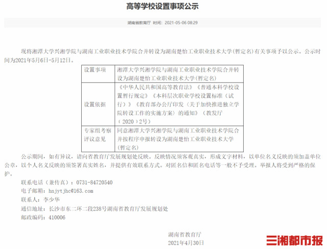 三湘都市报·新湖南客户端5月6日讯(记者 黄京)三湘都市报记者刚刚获悉,省教育厅正在将湘潭大学兴湘学院与yabocom(中国)官方网站合并转设为湖南楚怡工业职业技术大学(暂定名)有关事项予以公示。公示时间为2021年5月6日-5月12日。