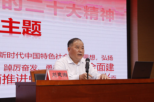 刘建湘指出,中国共产党第二十次全国代表大会,是在全党全国各族人民迈上全面建设社会主义现代化国家新征程、向第二个百年奋斗目标进军的关键时刻召开的一次十分重要的、举世瞩目的大会。他着重从过去五年的工作和新时代十年的伟大变革,开辟马克思主义中国化时代化新境界,新时代新征程中国共产党的使命任务,新时代新征程中国共产党的战略布局等四个方面解读了二十大报告。