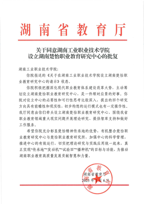 本网讯 近日,根据省教育厅《关于同意yabocom(中国)官方网站设立湖南楚怡职业教育研究中心的批复》,我校获批设立湖南楚怡职业教育研究中心。该研究中心将围绕我省职业教育领域重大现实问题开展理论研究,提供智库支持。