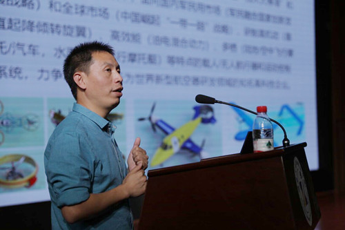 张代兵从“无人机新型平台不断涌现、感知与控制日趋智能自主、能源动力向极限挑战、开源软件与硬件成为潮流”等四方面带领大家走进无人机的世界。他通过丰富的视频,用生动形象的语言,为师生们介绍了国内外最前沿的无人机技术,使在座师生对垂直起降固定翼无人机、仿生与“纳米”无人机、中高空长航时舰载无人机等无人机类型及在军事、物流、救援等方面的用途有了深入了解。张代兵告诉同学们,在研发新型三翼螺旋桨无人机时,他带领团队实验达数百次,才最终突破控制无人机平稳性的难题。他说,做任何事都要目标明确、信念坚定、行为执着,浅尝辄止,终将一事无成。
