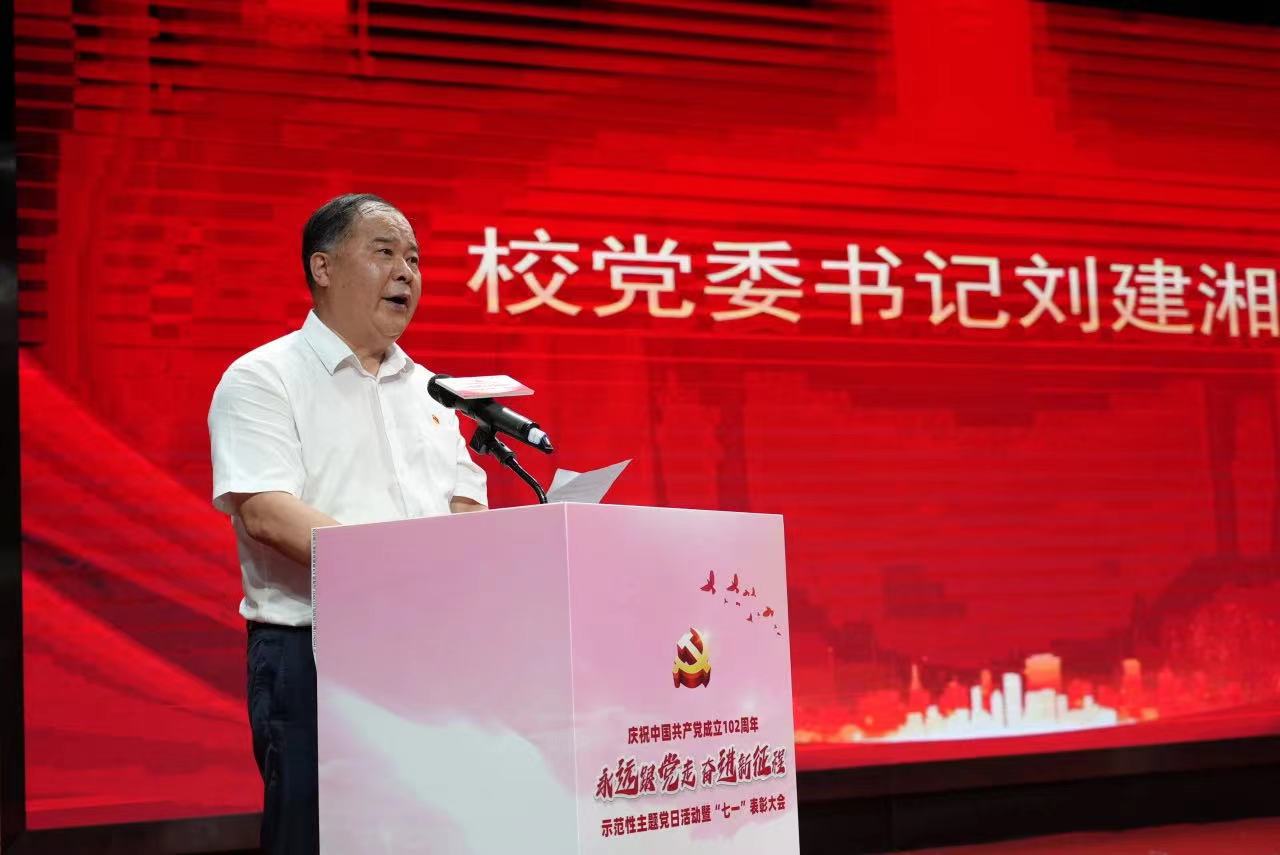 党委书记刘建湘发表题为《自信自强 守正创新 踔厉奋发 勇毅前行 在新时代新征程上奋力开创高质量发展新局面》主题讲话。他代表学校党委,向全校各级党组织和辛勤工作在教学、科研、管理、服务等一线的全体党员,向曾经为学校建设发展作出贡献的离退休老领导、老干部、老教师,向勤奋学习、敢于创新、勇于探索的青年学生党员致以节日的问候,向此次受到表彰的先进集体和先进个人,表示热烈的祝贺。他表示,近两年来,我们坚持强党建“谋大局”,抓改革“应变局”,促发展“开新局”,抢抓机遇、苦干实干,学校事业发展稳中提质、稳中向好。他强调,在内外形势持续向好的环境下,我们要认清形势,顽强拼搏,坚定背水一战的决心和信心;瞄准靶心,精准发力,聚焦体现高质量的目标任务;以上率下,众志成城,凝聚决战决胜的强大合力,团结带领全体师生以奋发昂扬的精神状态、扎实进取的工作作风、只争朝夕的拼搏劲头,奋勇争先,踔厉奋发,勇毅前行,奋力开创高质量发展新局面。
