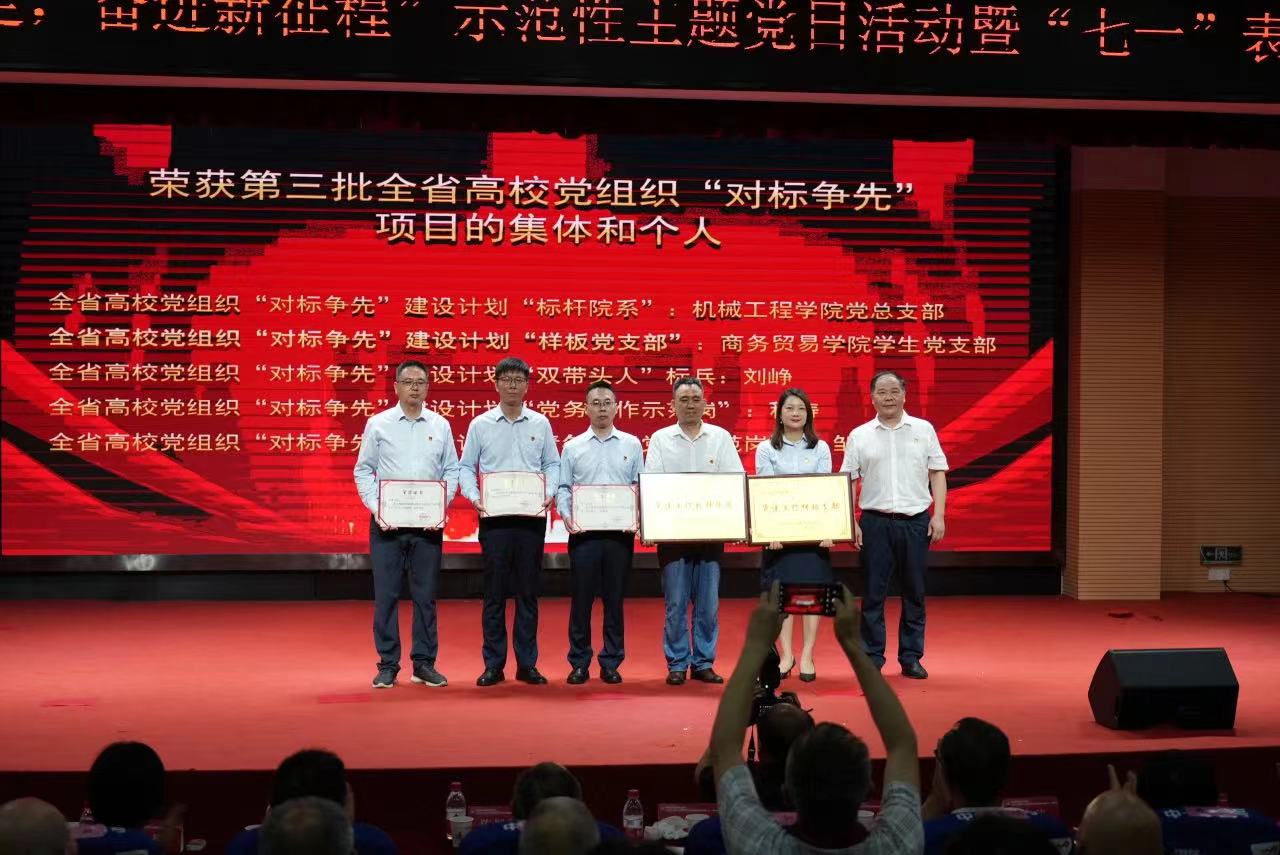 会上,表彰了全省高校党组织“对标争先”计划第三批项目入选集体、个人,学校机械工程学院党总支部立项第三批全省高校党建“标杆院系”,商务贸易学院学生党支部立项第三批全省高校党建“样板支部”,电气工程学院党总支部书记(教师党支部书记)刘峥获评第三批全省高校教师党支部书记“双带头人”标兵,组织人事部(教师工作部)副部长程涛获评第三批全省高校“党务工作示范岗”,汽车工程学院党总支部党员教师邹洪富获评第三批全省高校“青年教工党员示范岗”。