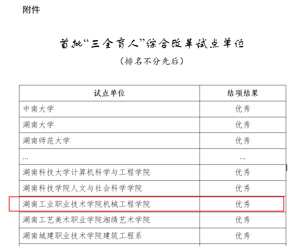 本网讯 1月26日至2月1日,中共湖南省委教育工委、湖南省教育厅对首批“三全育人”综合改革试点单位项目结项结果进行公示。我校机械工程学院“三全育人”改革试点院系验收等级为优秀。