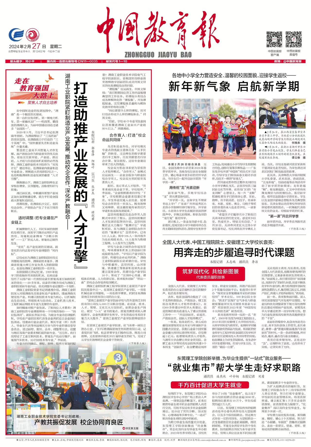 本网讯 2024年2月27日,中国教育报头版“走在教育强国大路上”专栏以《湖南工业职院紧盯制造业产业发展,推动校企合作、深化产教融合——打造助推产业发展的“人才引擎”》为题,从“适时调整:把专业建在产业链上”“合作育人:打造‘校企命运共同体’”“人才支撑:创新研发赋能产业发展”三个方面,专题报道了学校聚焦人才自主培养的具体经验做法。