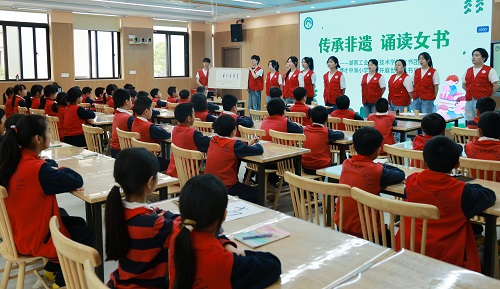 这是学校女书志愿服务团队与长沙市岳麓区博才中海小学共同开展的“传承非遗 诵读女书”世界读书日活动现场。活动中,大小朋友们齐聚一堂,共同领略千年女书文化的魅力。