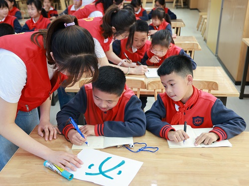 “在华夏大地悠久的历史长河中,流淌着一种独特的文字——女书。这种神秘文字,如同一个个神奇的密码,承载着‘自尊自立自强’的女性奋斗精神,铭刻了千年女性可歌可泣的历史记忆。”学校女书志愿服务团队项目负责人胡敏老师,是国家级非遗女书传人弟子,活动现场,她向小学生们介绍了女书非遗的发展历史与现状,并鼓励小朋友们与团队的青年志愿们合作,共同传承与弘扬女书文化。
