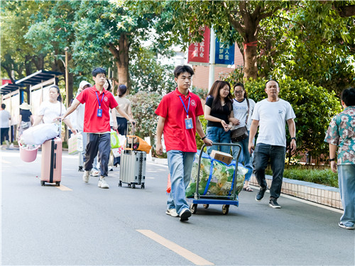“你好,去机械楼往这边走。”“需要寄存行李吗?”在火车站高铁站接站点、校门口、迎新报到点、宿舍楼,志愿者们帮助新生搬运行李、讲解报到流程、介绍校园环境。学校安排了爱心接驳车,往返于服务站和学生宿舍,帮助新生运送行李。学校保安和国旗护卫队的学生们引导车辆行驶,避免道路拥堵。