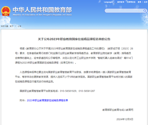 本网讯 12月9日,教育部公布2023年职业教育国家在线精品课程遴选结果,我校《工业机器人现场编程》等5门课程被认定为2023年职业教育国家在线精品课程,入选数量位居湖南省同类院校首列。
