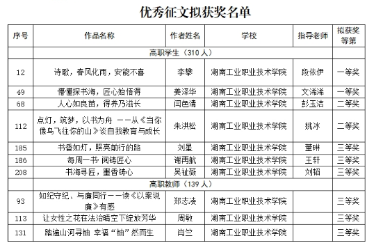 在湖南省职业院校楚怡读书行动“主题征文”大赛中,郑志凌、周敏、肖竺获得高职教师组三等奖;李攀(指导老师段依伊)、姜泽华(指导老师文浠浠)获得学生组一等奖,闫色清(指导老师彭玉洁)、朱洪松(指导老师姚冰)获得学生组二等奖,刘星(指导老师董琳)、谢再航(指导老师王轩)、吴祉薇(指导老师刘韬)获得学生组三等奖。
