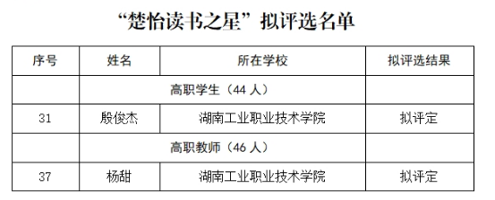 本网讯 近日,湖南省教育厅发布《2024年湖南省职业院校楚怡读书行动拟获奖名单公示》,学校共获奖12项,其中获“主题征文”一等奖2项、二等奖2项、三等奖6项,工业设计与艺术学院杨甜获评高职教师组“楚怡读书之星”、电气工程学院殷俊杰获评高职学生组“楚怡读书之星”。