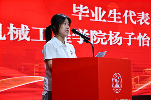 “数控车间的反复磨炼、比赛前的彻夜攻关、校园夜跑的青春活力……工院如同一片广袤、包容、营养丰沃的土壤,让我们能够尽情拥抱不设限的大学生活。”毕业生代表、中国国际大学生创新大赛金奖获得者、国家奖学金获得者杨子怡回顾了大学生活。她祝福各位毕业生以专业为基,以梦想为帆,在各自的人生赛道上奋勇争先。