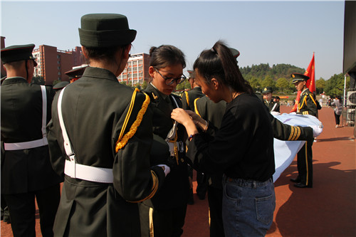 国旗礼仪队的王政钦同学今年是以指挥的身份出现在同学们面前,据他介绍,每次下训脱下礼服,队员们都像洗了个澡一样,也正是因为学弟学妹们这种刻苦训练的精神,训练效果一天天显现。“我们会尽可能严格要求他们,让他们在这种大型活动中能展示自己最好的一面。”