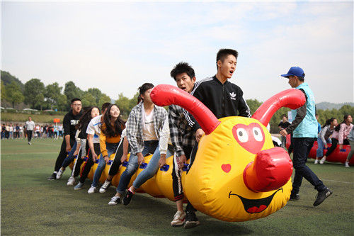 学生选手们奋力拼搏,老师们也不干落后,在属于自己的赛场上挥洒汗水。彩色的小轮胎、粉色的瑜伽球、红黄相间的大气球、憨态可掬的毛毛虫在师生们的手中、背上、脚下欢快的起舞。其中,五颜六色的“毛毛虫”身上“骑”着一整排参赛者,高个子运动员提着“毛毛虫”奔跑,小个子运动员则被双脚“架空”,坐在“毛毛虫”背上一脸尬笑;“扭转乾坤”比赛中,八人托起大气球,承担气球重力和空气阻力的同时飞速奔跑……