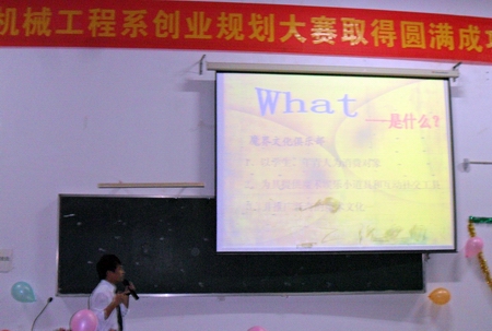 第一代表团的创业项目为“邻家菜篮”,用网上订购、送货上门的服务方式来销售蔬菜,以新颖、灵活的方式解决了家庭主妇买菜难的问题;第四代表队的创业项目为“笑笑书”,他们针对儿童天性设计了一种可以活动的电影书,对儿童的成长有一定的益智作用,深受在场同学的喜爱;第六代表队的创业项目是“威远数控加工公司”,这是一家主要靠外协来盈利的公司,目前他们已确认将获得20万元左右的资金投资和国家大学生创业贷款,并得到了株洲开拓工具有限公司的赞助和支持,这是所有代表队中唯一一支以专业知识为主线的创业团队。其中,“笑笑书”与“威远数控加工公司”都是已付诸实践、逐渐成熟的规划项目,他们的创业理念鼓舞了在座的机械专业学子。最终,“笑笑书”、“邻家菜篮”、“威远数控加工公司”三个项目分别荣获本次比赛的一、二、三等奖。