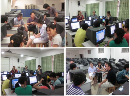 老师与学生一起学习我院十二五规划,并展开探讨