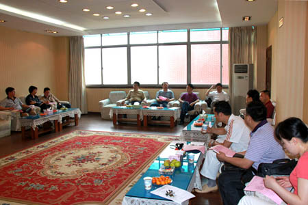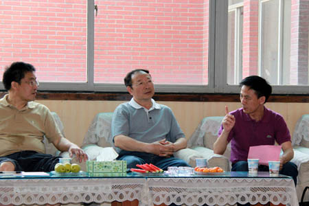 学院党委书记廖洪元(中)、学院党委副书记龙承海(左一)与来访同仁热烈交流